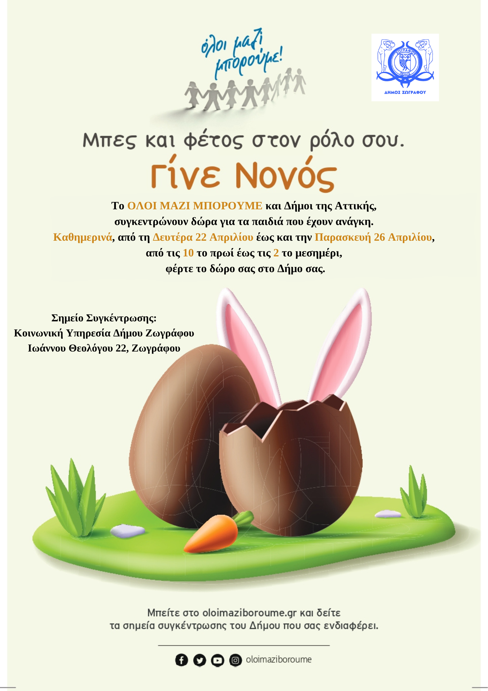 Με σύνθημα «Μπες και φέτος στο ρόλο σου! Γίνε Νονός» o Δήμος Ζωγράφου και το ΟΛΟΙ ΜΑΖΙ ΜΠΟΡΟΥΜΕ διοργανώνουν δράση συγκέντρωσης Πασχαλινών δώρων, για τα παιδιά που έχουν ανάγκη.
