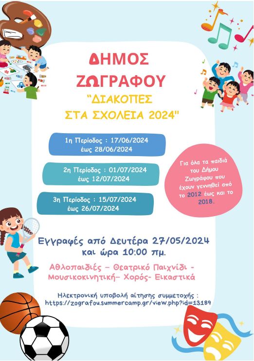Ο Δήμος Ζωγράφου, στο πλαίσιο της φροντίδας για τα παιδιά του Δήμου, θα υλοποιήσει για ακόμη μια χρονιά το πρόγραμμα Καλοκαιρινής Δημιουργικής Απασχόλησης «ΔΙΑΚΟΠΕΣ ΣΤΑ ΣΧΟΛΕΙΑ» για τα παιδιά των Δημοτικών Σχολείων και Νηπιαγωγείων του Δήμου, που έχουν γεννηθεί από το 2012 έως και το 2018. Το Πρόγραμμα της Καλοκαιρινής Δημιουργικής Απασχόλησης, είναι δωρεάν και έχει ως στόχο να προσφέρει στα παιδιά ημερήσια δημιουργική απασχόληση ψυχαγωγίας και γνώσης, μέσα από διάφορες δραστηριότητες βιωματικού χαρακτήρα και παράλληλα να βοηθήσει τους γονείς – κατοίκους της πόλης μετά το κλείσιμο των σχολείων.