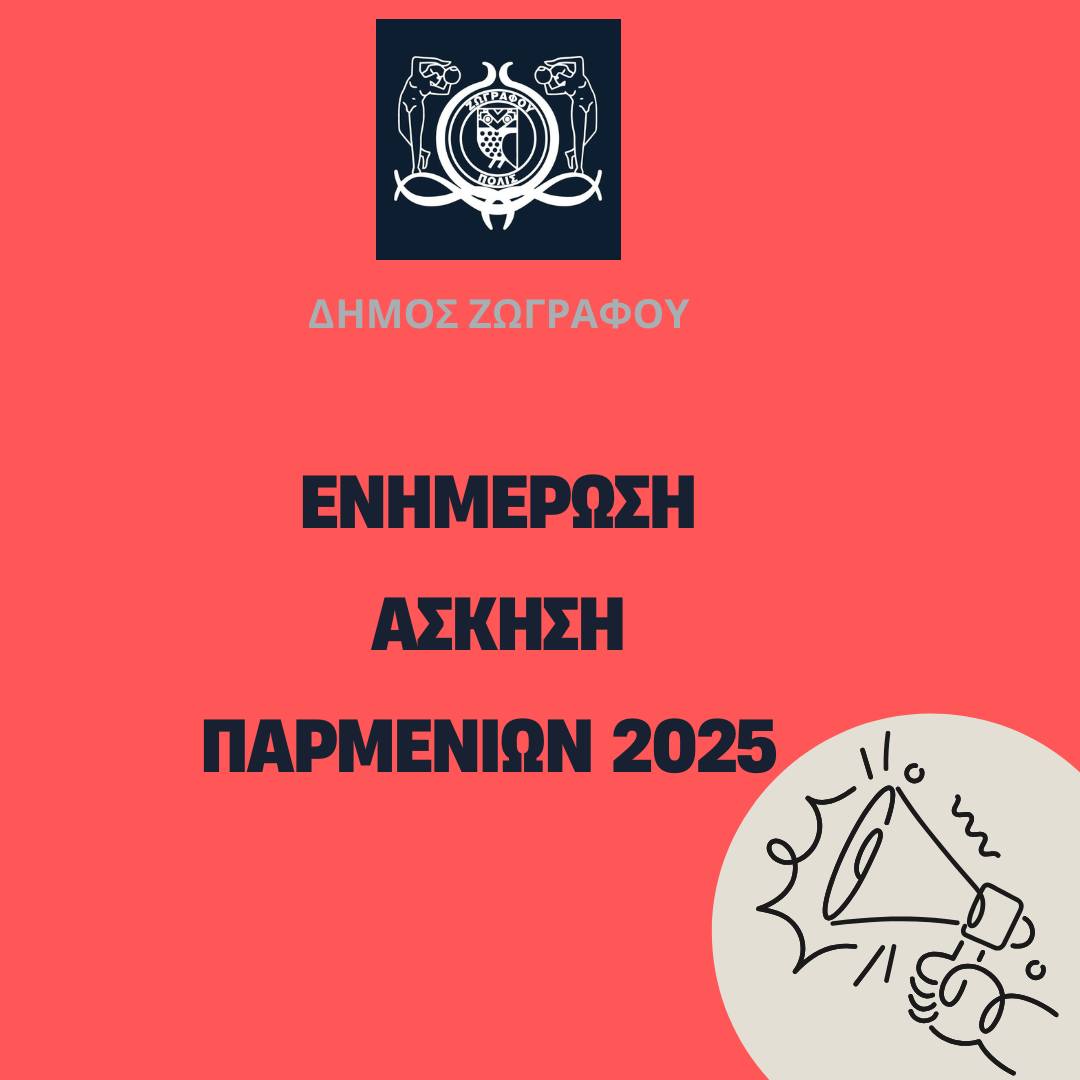 Μπορεί να είναι γραφικό ‎κείμενο που λέει "‎EV GJAY ΔΗΜΟΣΖΩΓΡΑΦΟΥ ΔΗΜΟΣ ΖΩΓΡΑΦΟΥ ΕΝΗΜΕΡΩΣΗ ΑΣΚΗΣΗ ΠΑΡΜΕΝΙΩΝ 2025 ١١١ ز _ای m‎"‎