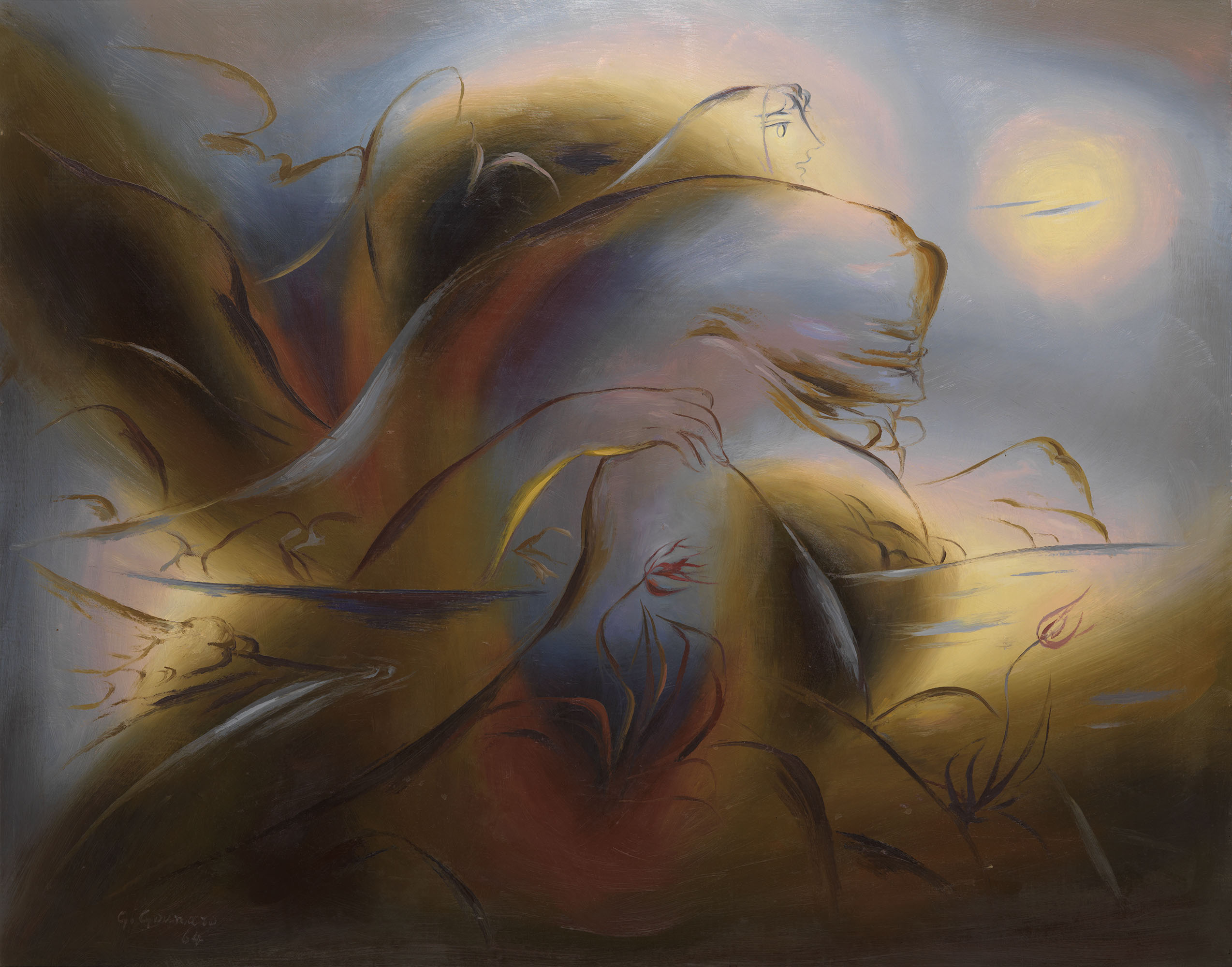 - Γιώργος Γουναρόπουλος, Γυναικείο κεφάλι και χέρι που βγαίνει από τη θάλασσα, 1964, ελαιογραφία σε καμβά, 69 x 86 εκ.