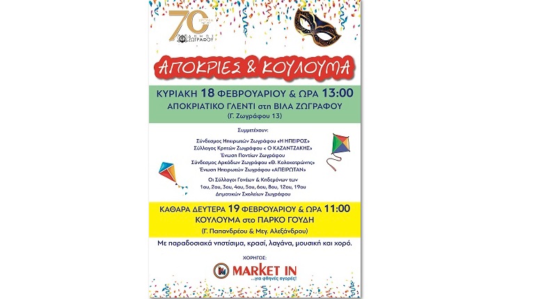 Την τελευταία Κυριακή των Αποκρεών, 18/2/2018, στις 13.00, σας περιμένουμε στο αποκριάτικο γλέντι του Δήμου μας, στη βίλα Ζωγράφου (Γ. Ζωγράφου 13).