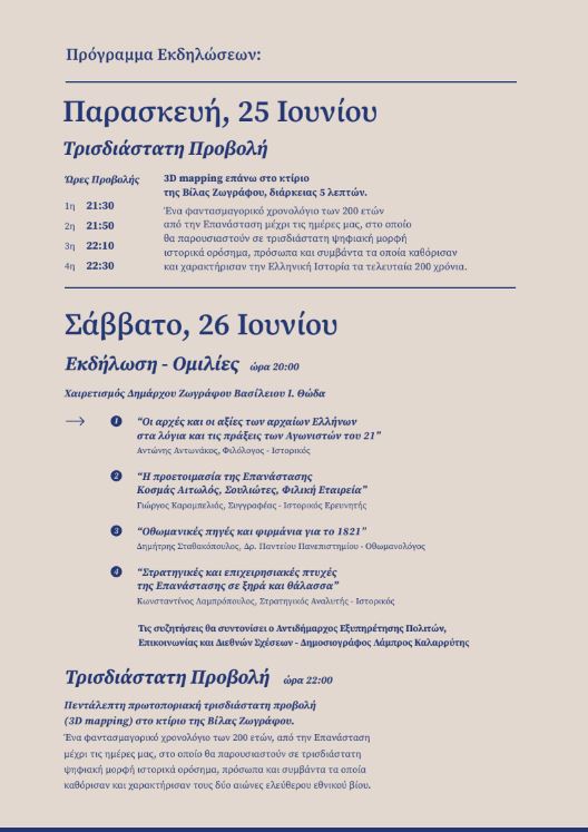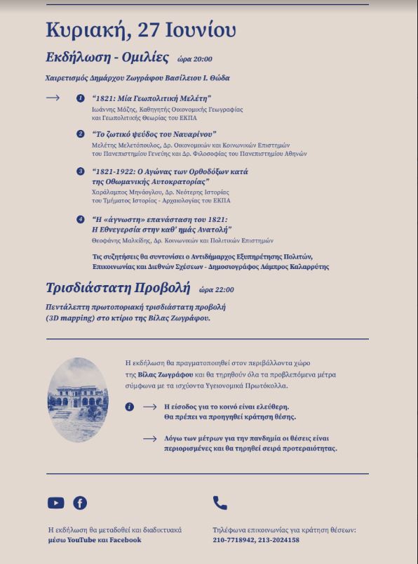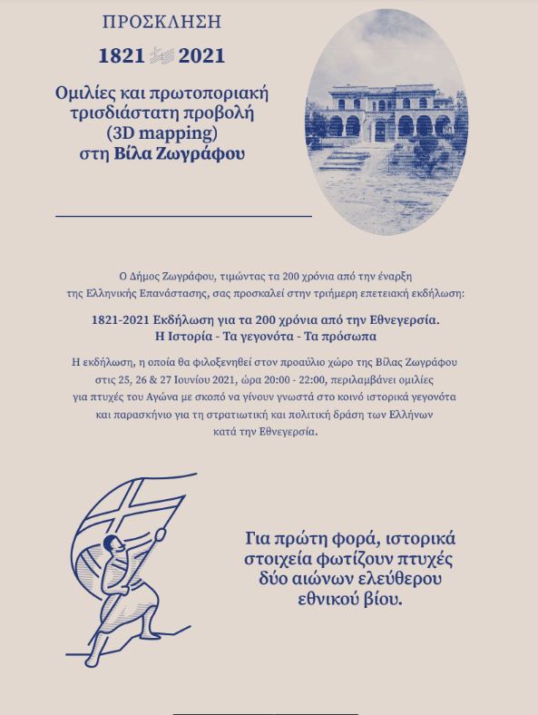 Ο Δήμος Ζωγράφου σας προσκαλεί στη μεγάλη επετειακή εκδήλωση που διοργανώνει για τα 200 χρόνια από την Ελληνική Επανάσταση «1821- 2021: Εκδήλωση για τα 200 χρόνια από την Εθνεγερσία. Η Ιστορία – Τα γεγονότα – Τα πρόσωπα», στις 25, 26 και 27 Ιουνίου 2021, στη Βίλα Ζωγράφου.
