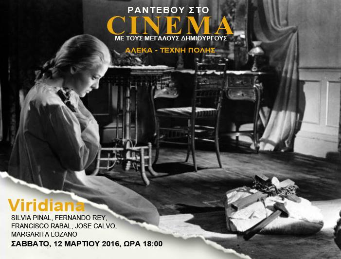 · Στις 18:00 θα προβληθεί η ταινία: Viridiana (Biridiana) του Luis Bunuel. Πρόκειται για τη βραβευμένη ταινία-ορόσημο του σουρεαλιστή σκηνοθέτη , η οποία ξεσήκωσε την οργή του Βατικανού και του φρανκικού καθεστώτος κατά την προβολή της . Η δόκιμη μοναχή Βιριδιάνα επισκέπτεται το θείος της , ο οποίος αποπειράται να τη βιάσει και αυτοκτονεί. Εκείνη γεμάτη τύψεις, εγκαταλείπει το μοναστήρι και αφιερώνεται σε αγαθοεργίες.