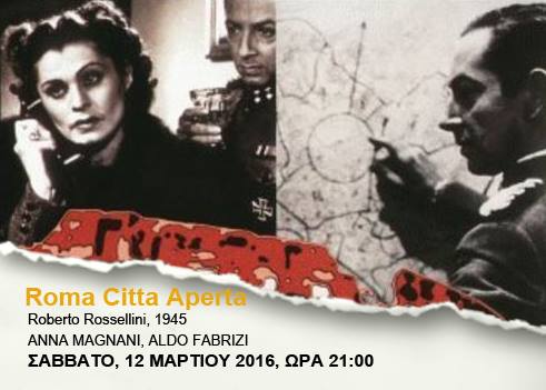 · Στις 21:00 θα προβληθεί η ταινία: ROMA CITTA APERTA (Ρώμη Ανοχύρωτη Πόλη) του Roberto Rossellini. Πρόκειται για την ταινία που έφερε αισθητική επανάσταση στην ιστορία του σινεμά καθώς αποτελεί το πρώτο έργο του «ιταλικού νεορεαλισμού» με θέμα την αντίσταση των Ιταλών δημοκρατών ενάντια στο φασισμό.