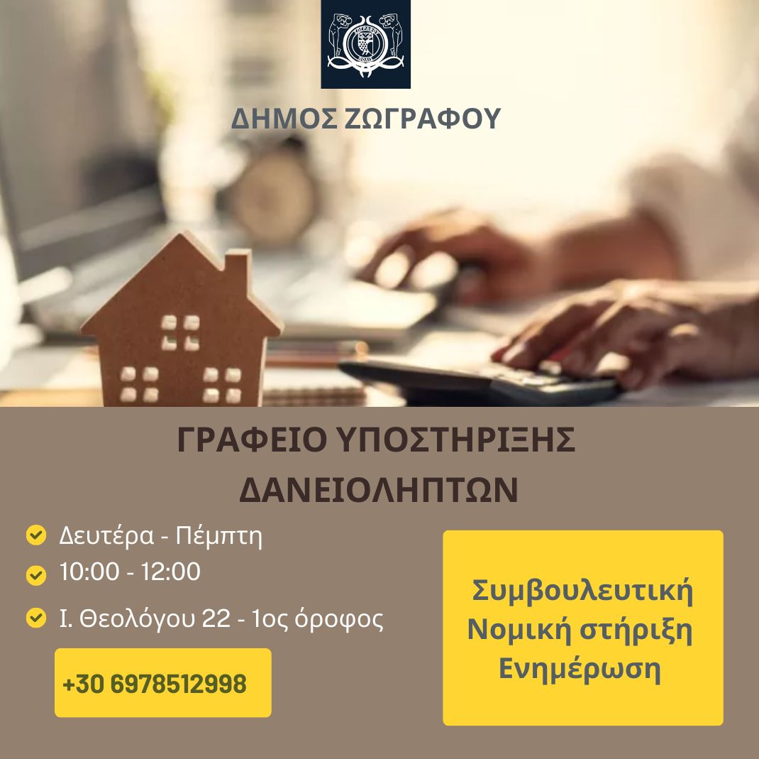 Ο Δήμος Ζωγράφου στέκεται αρωγός στους δανειολήπτες που δυσκολεύονται ή αδυνατούν να εξυπηρετήσουν τα χρέη τους, προσφέροντας δωρεάν συμβουλευτική και νομική στήριξη από εξειδικευμένους επαγγελματίες, μέσω του νέου Γραφείου Υποστήριξης Δανειοληπτών που εγκαινιάζεται την ερχόμενη εβδομάδα