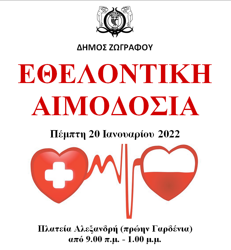 Ο Δήμος Ζωγράφου σε συνεργασία με τον φορέα αιμοληψίας του Λαϊκού Νοσοκομείου διοργανώνει νέα Εθελοντική Αιμοδοσία, την Πέμπτη 20 Ιανουαρίου 2022, στην πλατεία Αλεξανδρή (πρώην Γαρδένια).