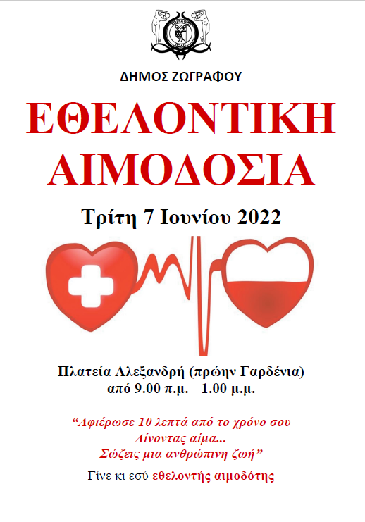 Ο Δήμος Ζωγράφου, λόγω της μεγάλης έλλειψης σε αποθέματα αίματος στη χώρα, διοργανώνει την Τρίτη 7 Ιουνίου 2022, στην πλατεία Αλεξανδρή (πρώην Γαρδένια), νέα Εθελοντική Αιμοδοσία σε συνεργασία με τον φορέα αιμοληψίας του Λαϊκού Νοσοκομείου.