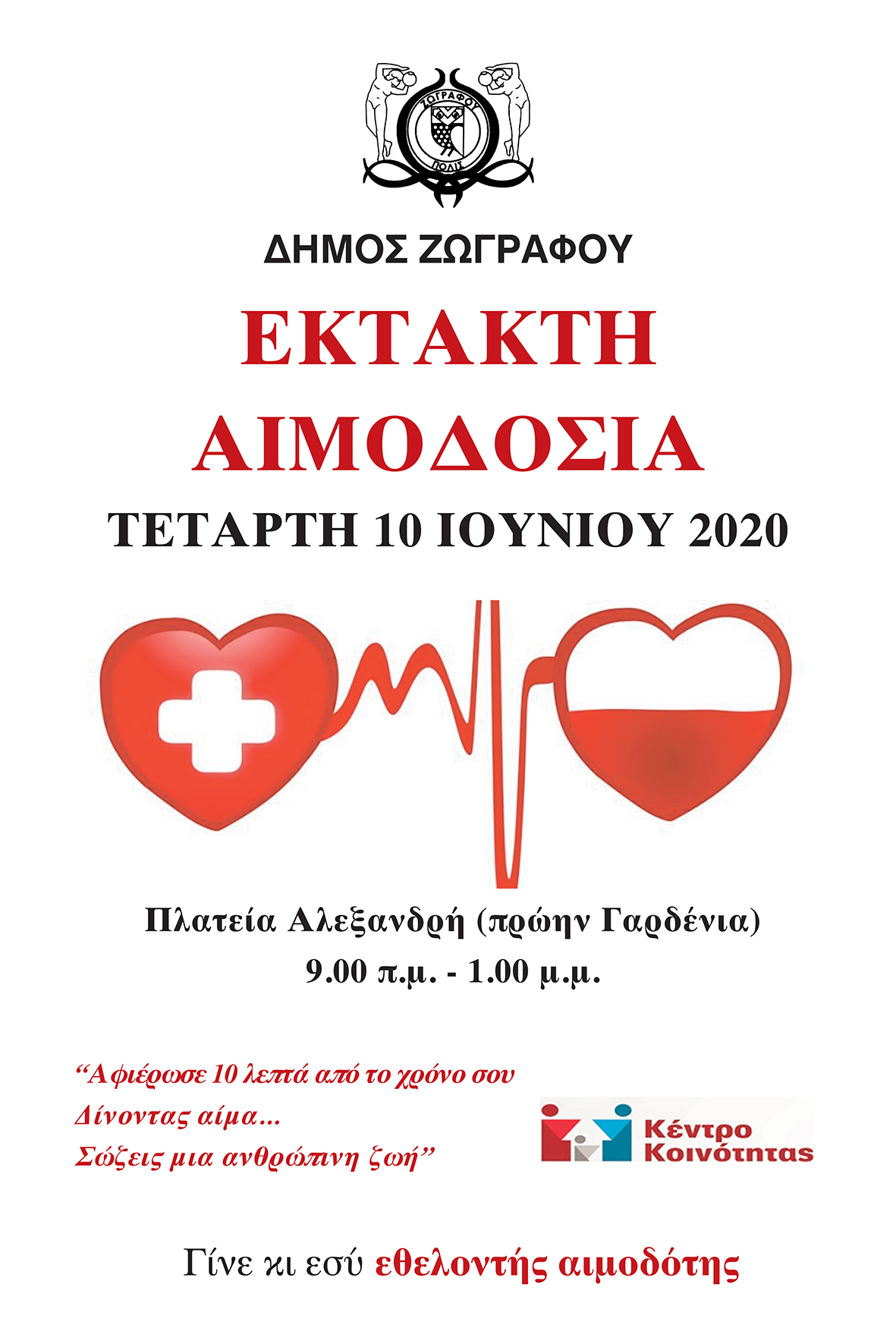 Σύμφωνα με την σύσταση του Παγκόσμιου Οργανισμού Υγείας και ανταποκρινόμενος στην έκκληση του Εθνικού Κέντρου Αιμοδοσίας (ΕΚΕΑ) σε εθελοντές αιμοδότες, σε συλλόγους και ομάδες αιμοδοτών και στις Υπηρεσίες Αιμοδοσίας των νοσοκομείων για τη συνέχιση των οργανωμένων δράσεων για αιμοδοσία, με στόχο να διασφαλιστεί η επάρκεια της χώρας σε αίμα, ο Δήμος Ζωγράφου διοργανώνει νέα έκτακτη εθελοντική αιμοδοσία την Τετάρτη 10 Ιουνίου 2020 στην Πλατεία Αλεξανδρή 09.00 -13.00