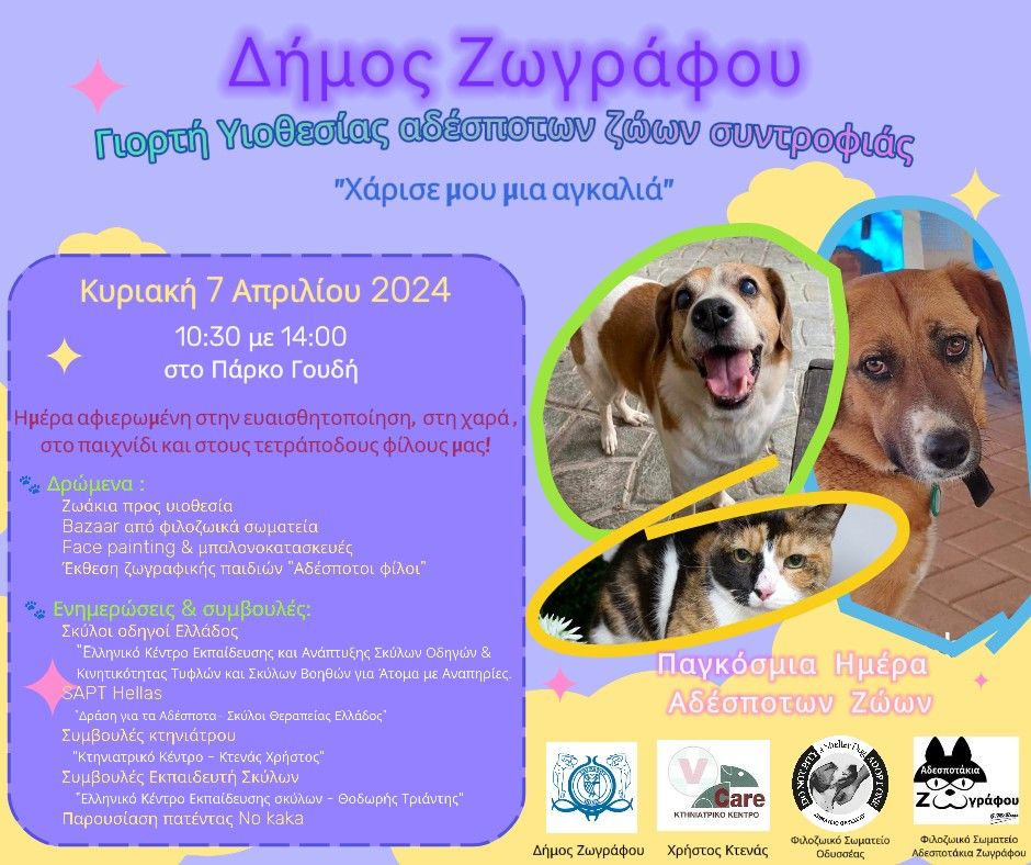 Με αφορμή την Παγκόσμια Ημέρα αδέσποτων ζώων, ο Δήμος μας μέσω της Κοινωνικής Υπηρεσίας και του Γραφείου Διαχείρισης Αδέσποτων Ζώων, διοργανώνει στο Πάρκο Γουδή, την Κυριακή 7 Απριλίου 2024, από τις 10:30 έως 14:00 εκδήλωση – γιορτή δημιουργικής ενημέρωσης, υιοθεσίας και χαράς με πρωταγωνιστές τα τετράποδα φιλαράκια μας!
