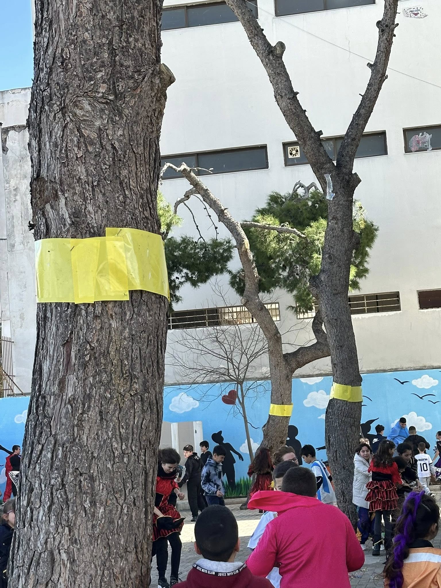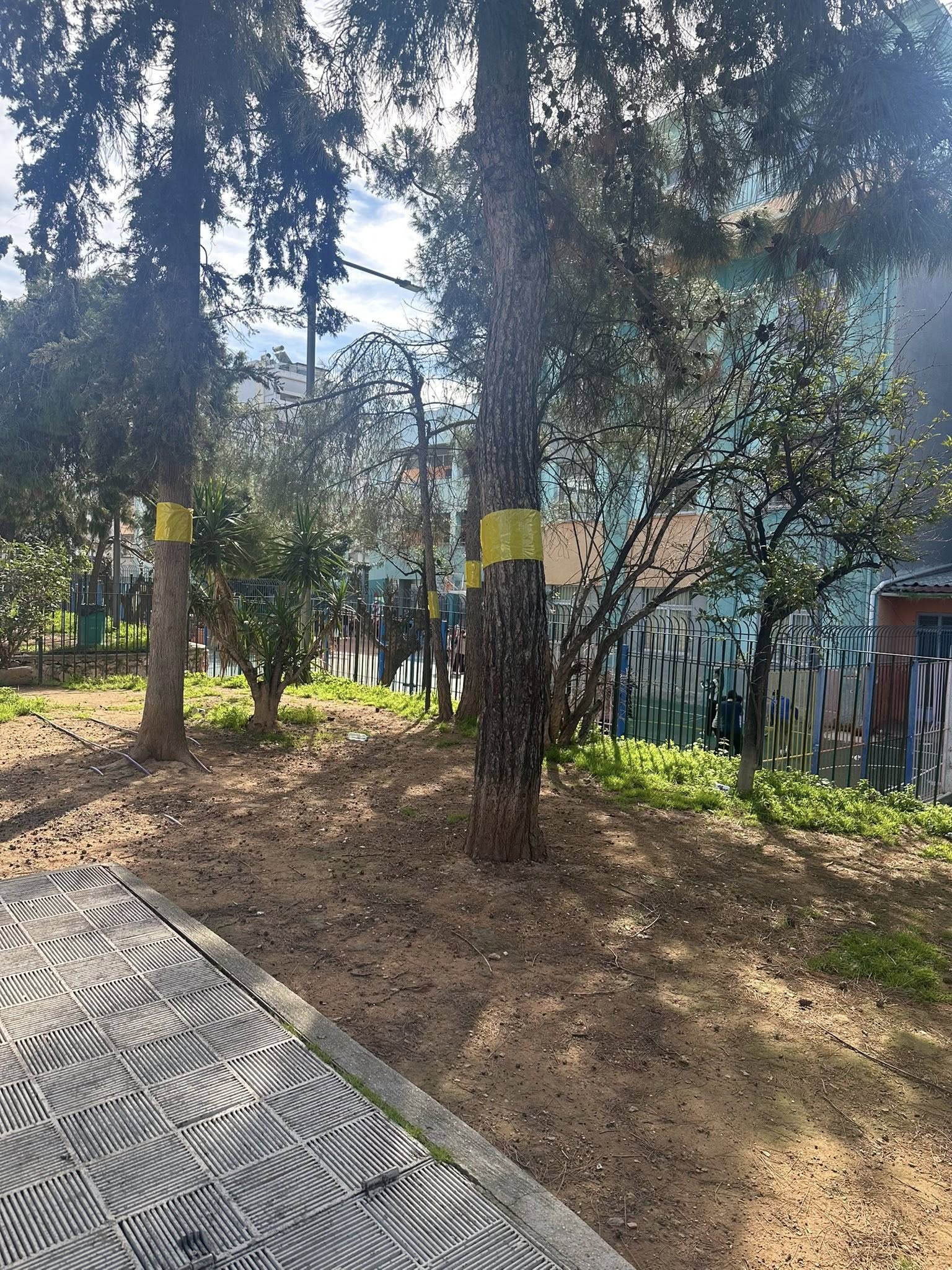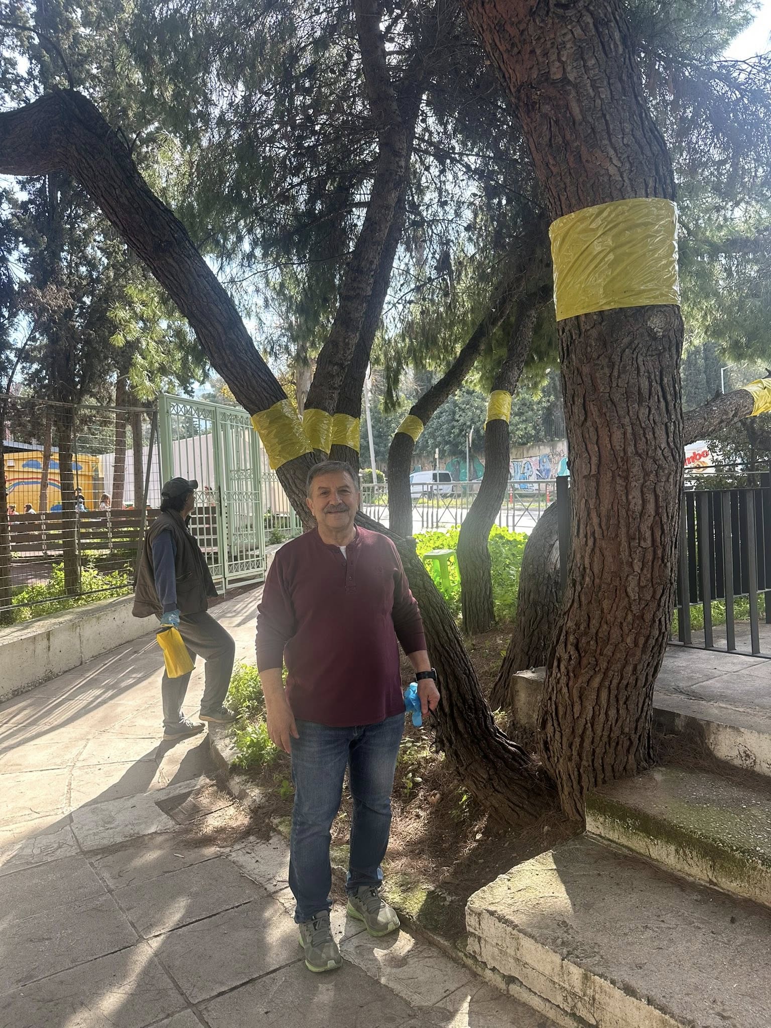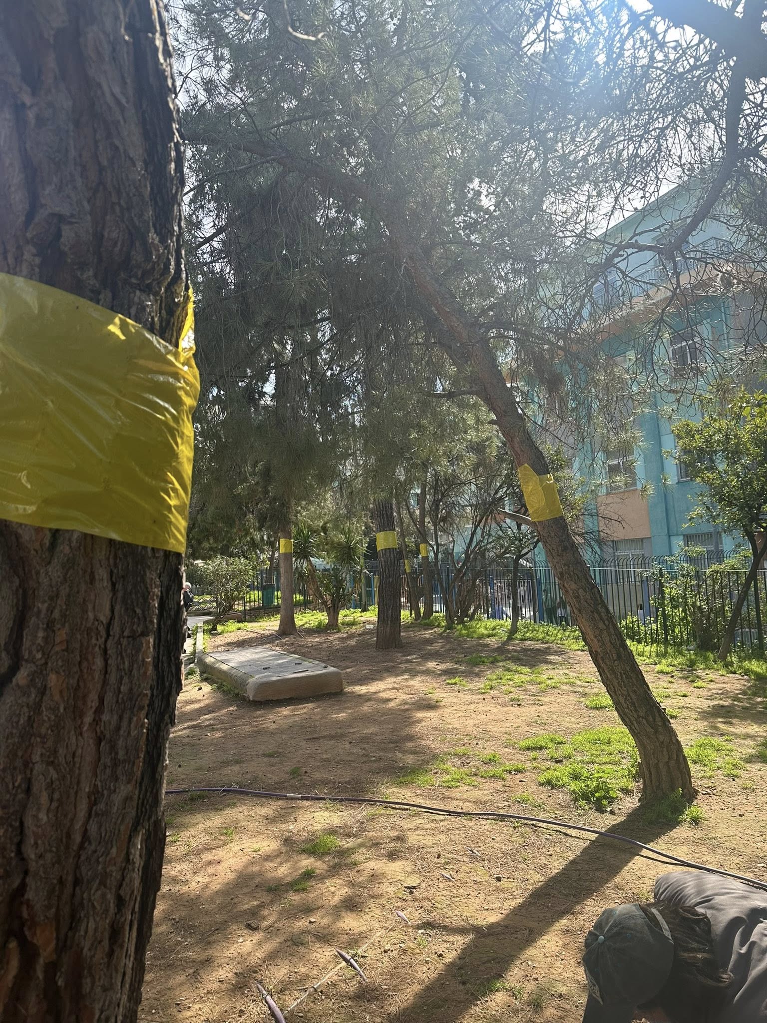 Ο Δήμος μας προχώρησε σήμερα στην τοποθέτηση ειδικών κίτρινων κολλητικών ταινιών στους κορμούς πεύκων σε διάφορα σημεία της πόλης, με στόχο τον περιορισμό της καθόδου των καμπιών.