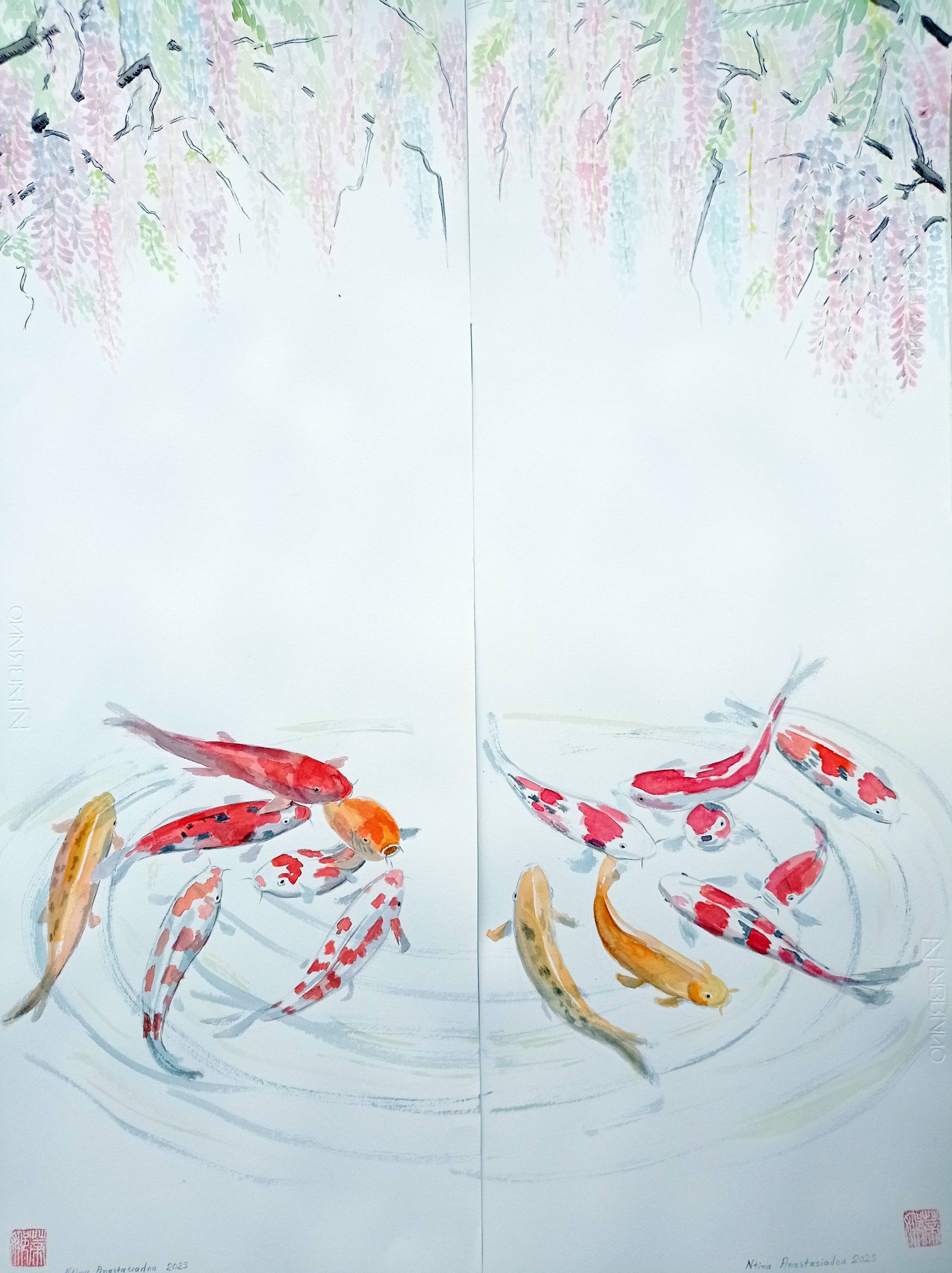 Ντίνα Αναστασιάδου, Κυπρίνοι και γλυσίνες Β, 2025, ακουαρέλα σε χειροποίητο χαρτί, 120×70 εκ.